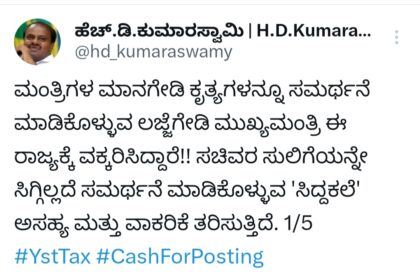 ಮಾನಗೇಡಿ ಕೃತ್ಯಗಳನ್ನು ಸಮರ್ಥಿಸುವ ಲಜ್ಜೆಗೇಡಿ ಸಿಎಂ ರಾಜ್ಯಕ್ಕೆ ವಕ್ಕರಿಸಿದ್ದಾರೆ – ಕುಮಾರಸ್ವಾಮಿ ಟ್ವೀಟ್