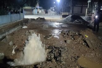 ಪೈಪ್ ಹೊಡೆದು ರಸ್ತೆಗೆ ಚಿಮ್ಮಿದ ಕುಡಿಯುವ ನೀರು