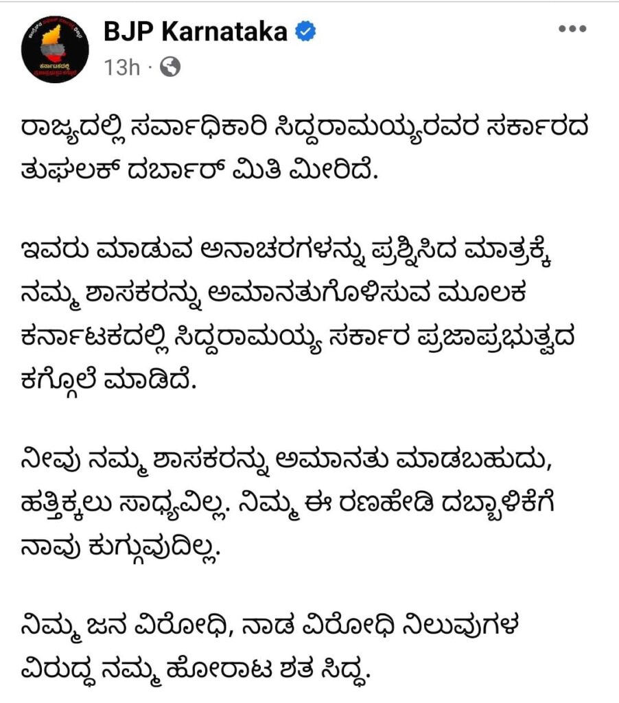ರಾಜ್ಯದಲ್ಲಿ ಸಿದ್ದರಾಮಯ್ಯ ಸರ್ಕಾರ ಪ್ರಜಾಪ್ರಭುತ್ವದ ಕಗ್ಗೊಲೆ ಮಾಡಿದೆ.ನೀವು ನಮ್ಮ ಶಾಸಕರನ್ನ ಅಮಾನತು ಮಾಡಬಹುದು,ಹತ್ತಿಕ್ಕಲು ಸಾಧ್ಯವಿಲ್ಲ.ನಿಮ್ಮ ಈ ರಣಹೇಡಿ ದಬ್ಬಾಳಿಕೆಗೆ ನಾವು ಕುಗ್ಗುವುದಿಲ್ಲ.ನಿಮ್ಮ ಜನ ವಿರೋಧಿ,ನಾಡ ವಿರೋಧಿ ನಿಲುವುಗಳ ವಿರುದ್ಧ ನಮ್ಮ ಹೋರಾಟ ಶತ ಸಿದ್ದ ಎಂದು ಸರಣಿ ಟ್ವಿಟ್ ಮಾಡುವ ಮೂಲಕ ಕಾಂಗ್ರೆಸ್ ವಿರುದ್ಧ ಬಿಜೆಪಿ ಕಿಡಿಕಾರಿದೆ.