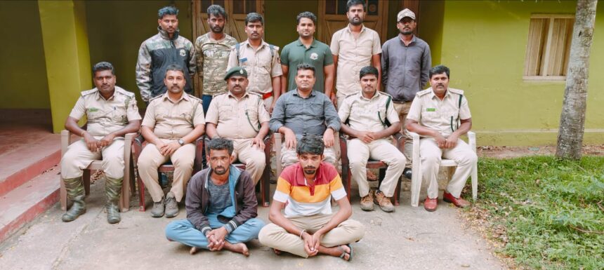 ಅಬ್ಬೂರಿನ ಮಧು,ಸಿಂಡೇನಹಳ್ಳಿ ಗ್ರಾಮದ ಪ್ರದೀಪ್ ಬಂಧಿತ ಆರೋಪಿಗಳು.ಉಳಿದ ಇಬ್ಬರು ಆರೋಪಿಗಳಾದ ರಾಜು,ಪ್ರಸನ್ನ ಬಂಧನಕ್ಕೆ ಬಲೆ ಬೀಸಿರುವ ಅರಣ್ಯ ಇಲಾಖೆ ಅಧಿಕಾರಿಗಳು.ಅರಣ್ಯಧಿಕಾರಿ ಹರ್ಷಕುಮಾರ್ ಮತ್ತು ನಾಗರಹೊಳೆ ಹುಲಿ ಸಂರಕ್ಷಿತ ಪ್ರದೇಶದ ದಯಾನಂದ್ ಆದೇಶದ ಮೇರೆಗೆ ದಾಳಿ ನಡೆಸಿರುವ ಅರಣ್ಯಾಧಿಕಾರಿಗಳು.