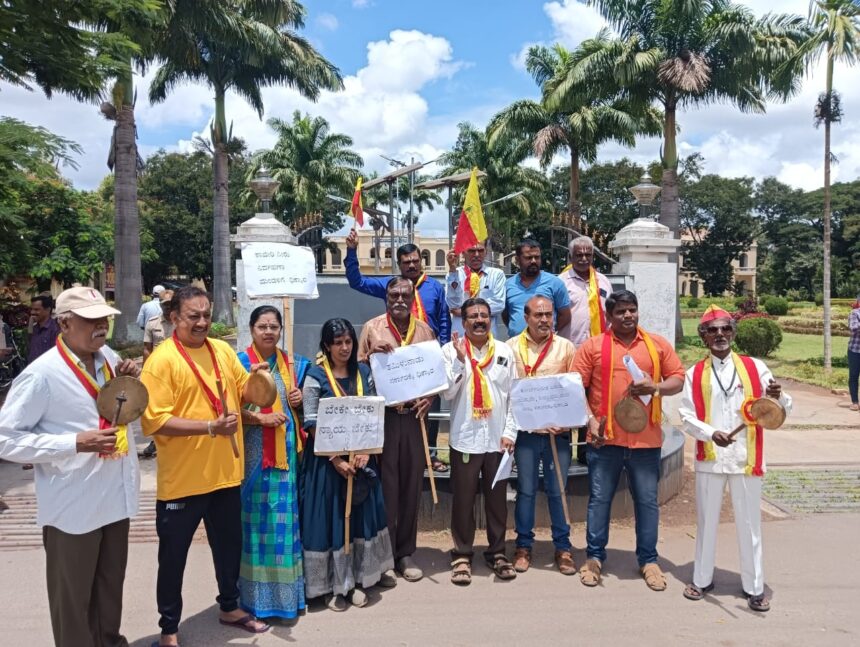 ಮೈಸೂರು : ತಮಿಳುನಾಡಿಗೆ ಕಾವೇರಿ ನೀರು ಹರಿಸುತ್ತಿರುವುದನ್ನ ಖಂಡಿಸಿ ಕರ್ನಾಟಕ ಸೇನಾ ಪಡೆ ವತಿಯಿಂದ ನಗರದ ಜಿಲ್ಲಾ ಪಂಚಾಯತ್ ಕಚೇರಿ ಬಳಿ ಪ್ರತಿಭಟನೆ ನಡೆಸಲಾಯಿತು.