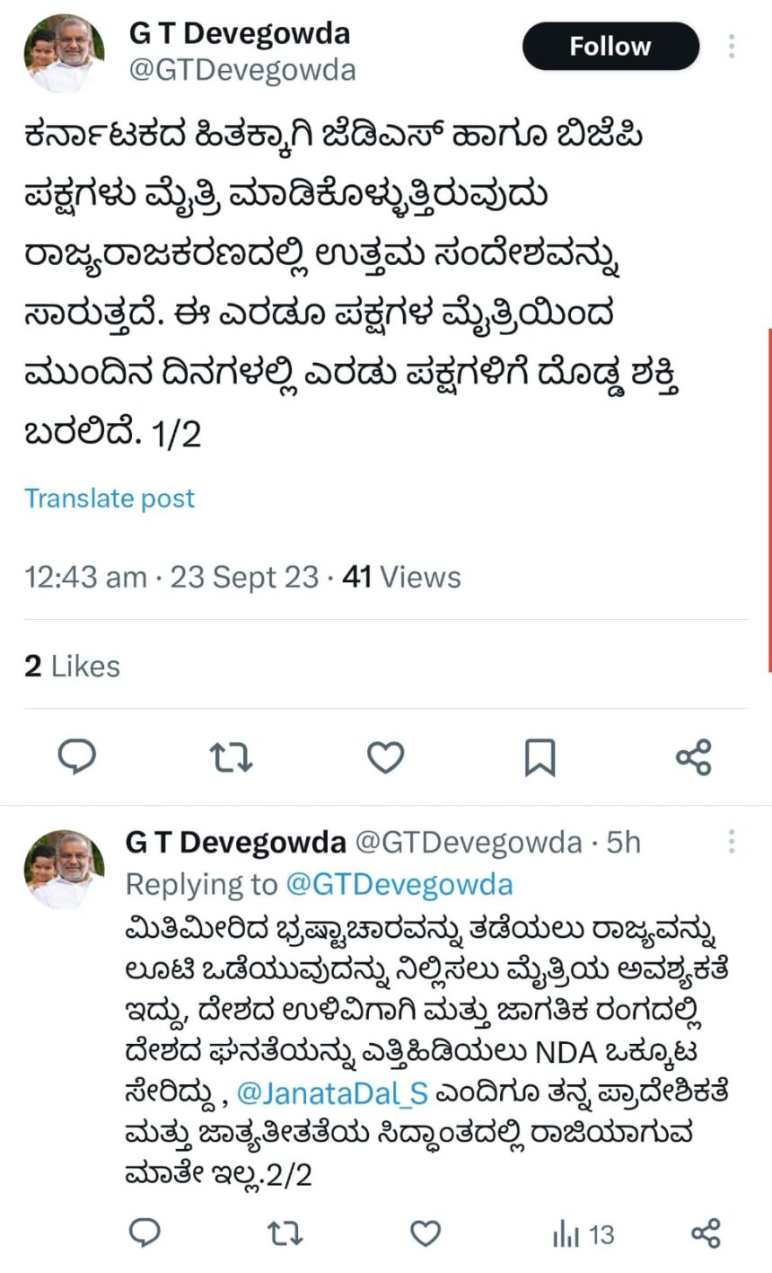 ಜೆಡಿಎಸ್ ಕೋರ್ ಕಮಿಟಿ ಅಧ್ಯಕ್ಷ ಜಿ ಟಿ ದೇವೇಗೌಡ ಟ್ವೀಟ್ ಮಾಡಿದ್ದಾರೆ.