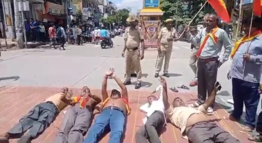 ಚಾಮರಾಜನಗರದ ಶ್ರೀ ಚಾಮರಾಜೇಶ್ವರ ಉದ್ಯಾನವನದಿಂದ ಶ್ರೀ ಭುವನೇಶ್ವರಿ ವೃತ್ತದ ತನಕ ಮೆರವಣಿಗೆಯಲ್ಲಿ ಬಂದ ಕನ್ನಡ ಪರ ಸಂಘಟನೆಯ ಕಾರ್ಯಕರ್ತರು ರಾಷ್ಟ್ರೀಯ ಹೆದ್ದಾರಿಯಲ್ಲಿ ಅರೆ ಬೆತ್ತಲಾಗಿ ಉರುಳು ಸೇವೆಗೆ ಮುಂದಾದರು.