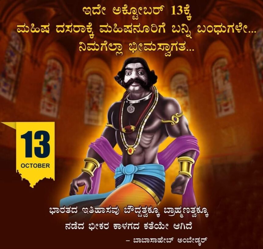 ಅ.13 ರ ಮಹಿಷ ದಸರಾ ಕಾರ್ಯಕ್ರಮಕ್ಕೆ ಮಹಿಷನೂರಿಗೆ ಬನ್ನಿ ಭೀಮ ಸ್ವಾಗತ ಅಂತಾ ಇರುವ ಪೋಸ್ಟರ್