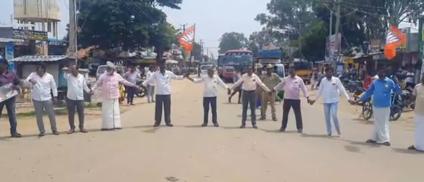 ಚಾಮರಾಜನಗರ ತಾಲ್ಲೂಕಿನ ಸಂತೇಮರಹಳ್ಳಿ ಗ್ರಾಮದ ವೃತ್ತದಲ್ಲಿ ಮಾಜಿ ಶಿಕ್ಷಣ ಸಚಿವ ಹಾಗೂ ಮಾಜಿ ಶಾಸಕ ಎನ್. ಮಹೇಶ್, ಮಾಜಿ ಶಾಸಕ ಎಸ್ ಬಾಲರಾಜು ನೇತೃತ್ವದಲ್ಲಿ ಬಿಜೆಪಿ ಕಾರ್ಯಕರ್ತರು ರಸ್ತೆ ತಡೆದು ಪ್ರತಿಭಟನೆ ನಡೆಸಿ ಆಕ್ರೋಶ ವ್ಯಕ್ತಪಡಿಸಿದರು.