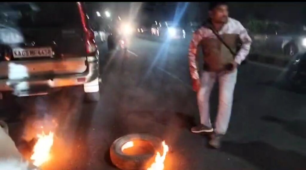 ಈ ನಡುವೆ ಕಾಂಗ್ರೆಸ್ ಕಾರ್ಯಕರ್ತ ಕಾರಿನಿಂದ ಬಂದು ಏಕಾಏಕಿ ಟಯರ್ ಗೆ ಬೆಂಕಿ ಹಾಕಿದ್ದಾರೆ