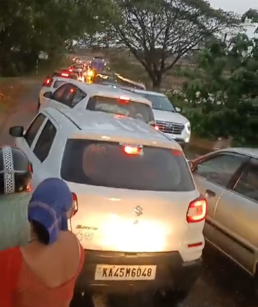 ಮಳೆಗೆ ಗಂಟೆಗಟ್ಟಲೆ ಸಾಲುಗಟ್ಟಿ ನಿಂತ ವಾಹನಗಳು